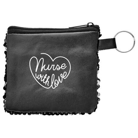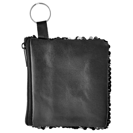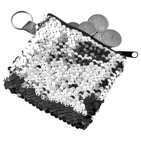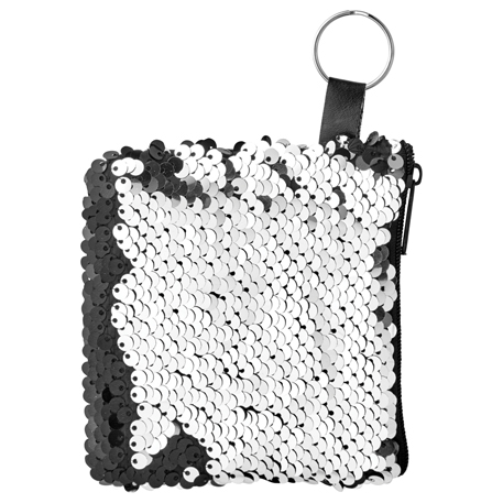 The Reversible Sequins Pocket Pouch features sequins in black and silver with a key ring attached. Perfect Size to hold keys, coins or cash. Keep cables, earbuds or cosmetics inside. Imprint on backside.