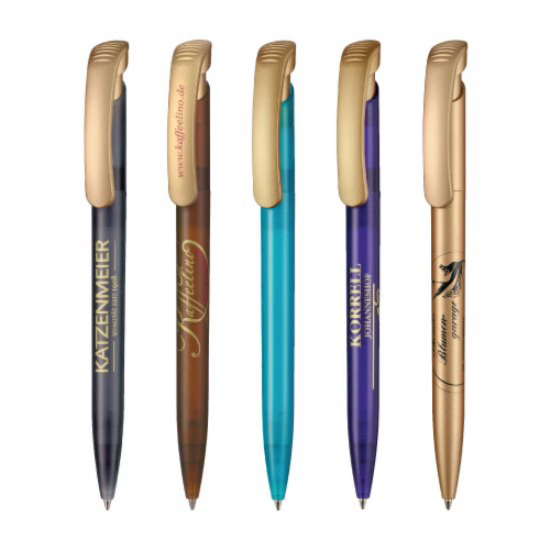 Translucent barrel ballpoint pen with satin gold clip.