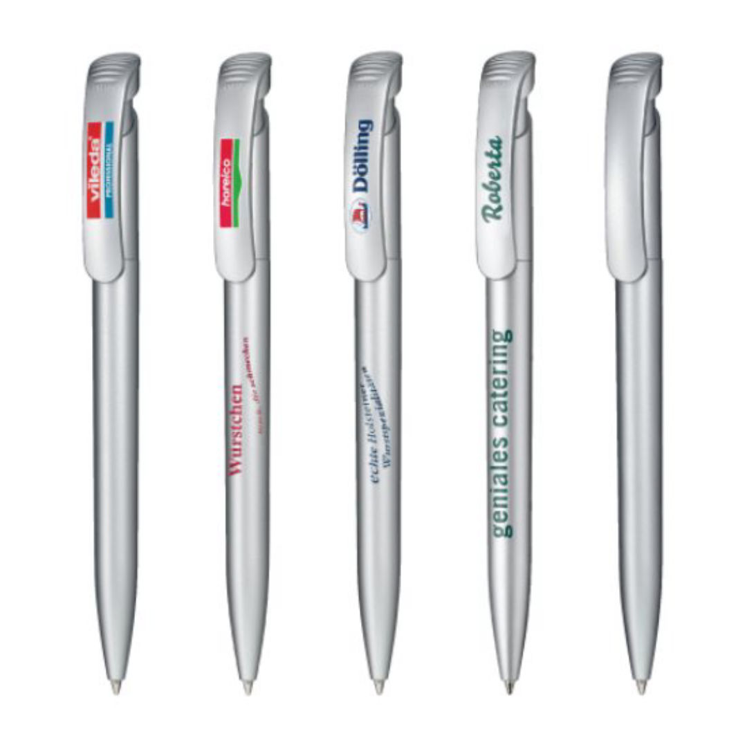 Ballpoint pen with satin silver barrel and clip.