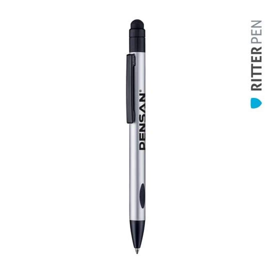 Elegant, slim metal ballpoint pen with twist action retraction and stylus for use on any tablet or smartphone.