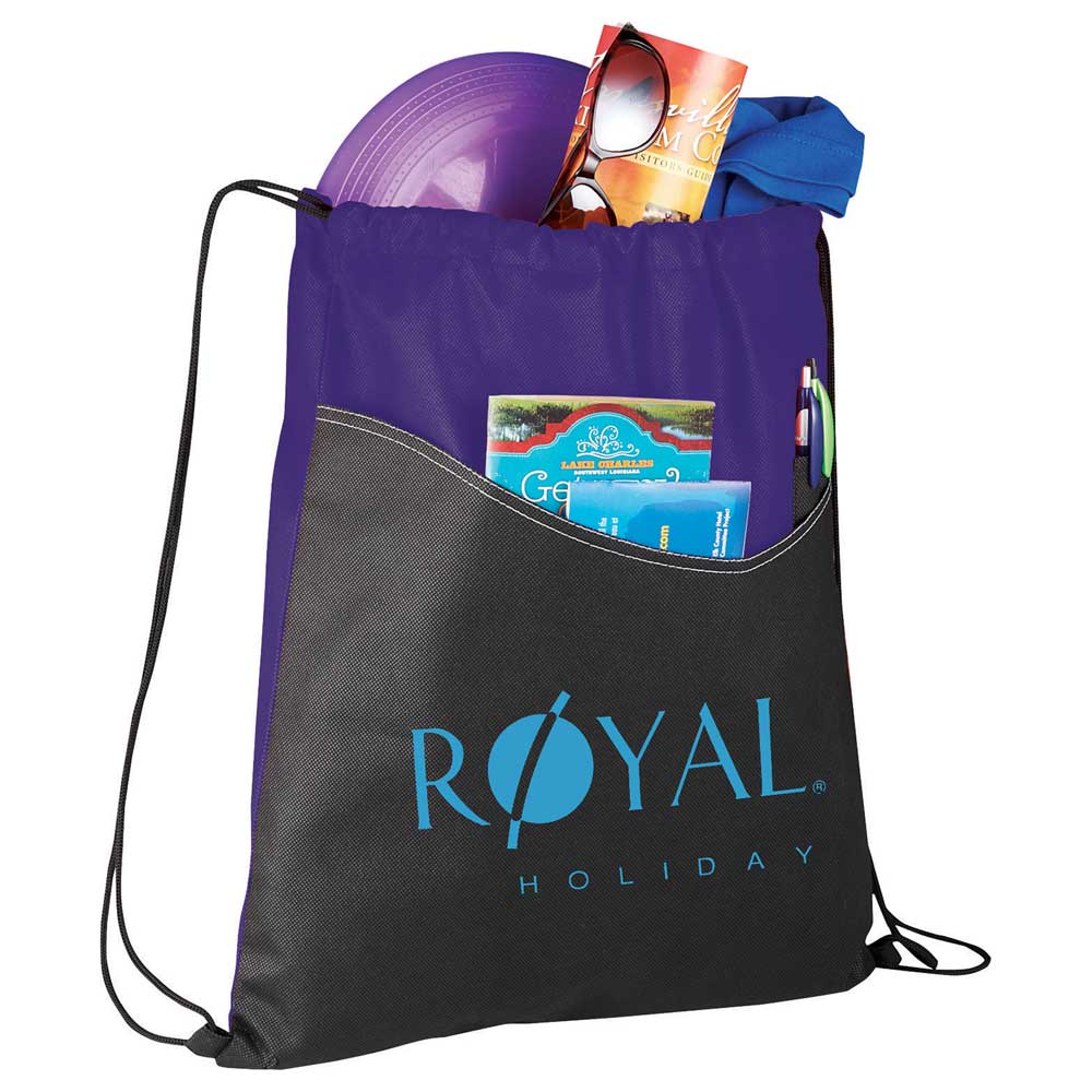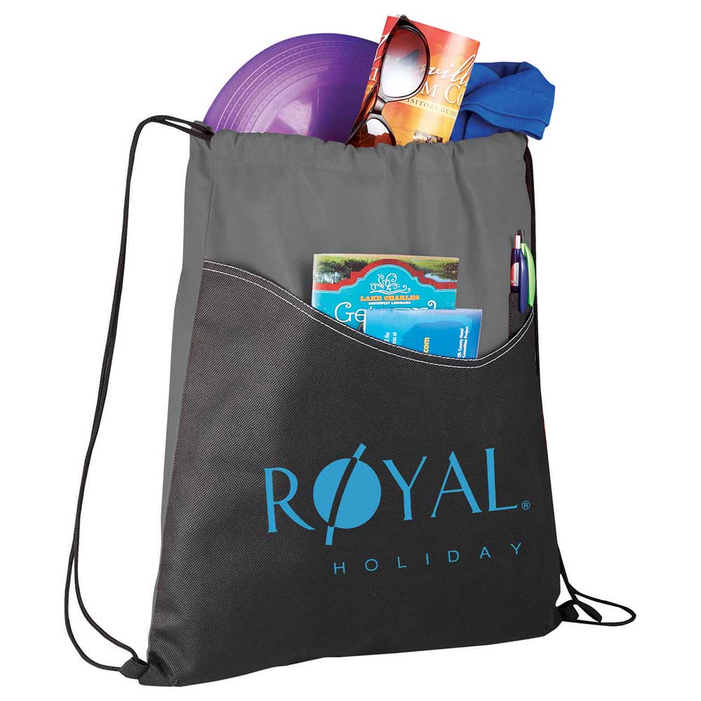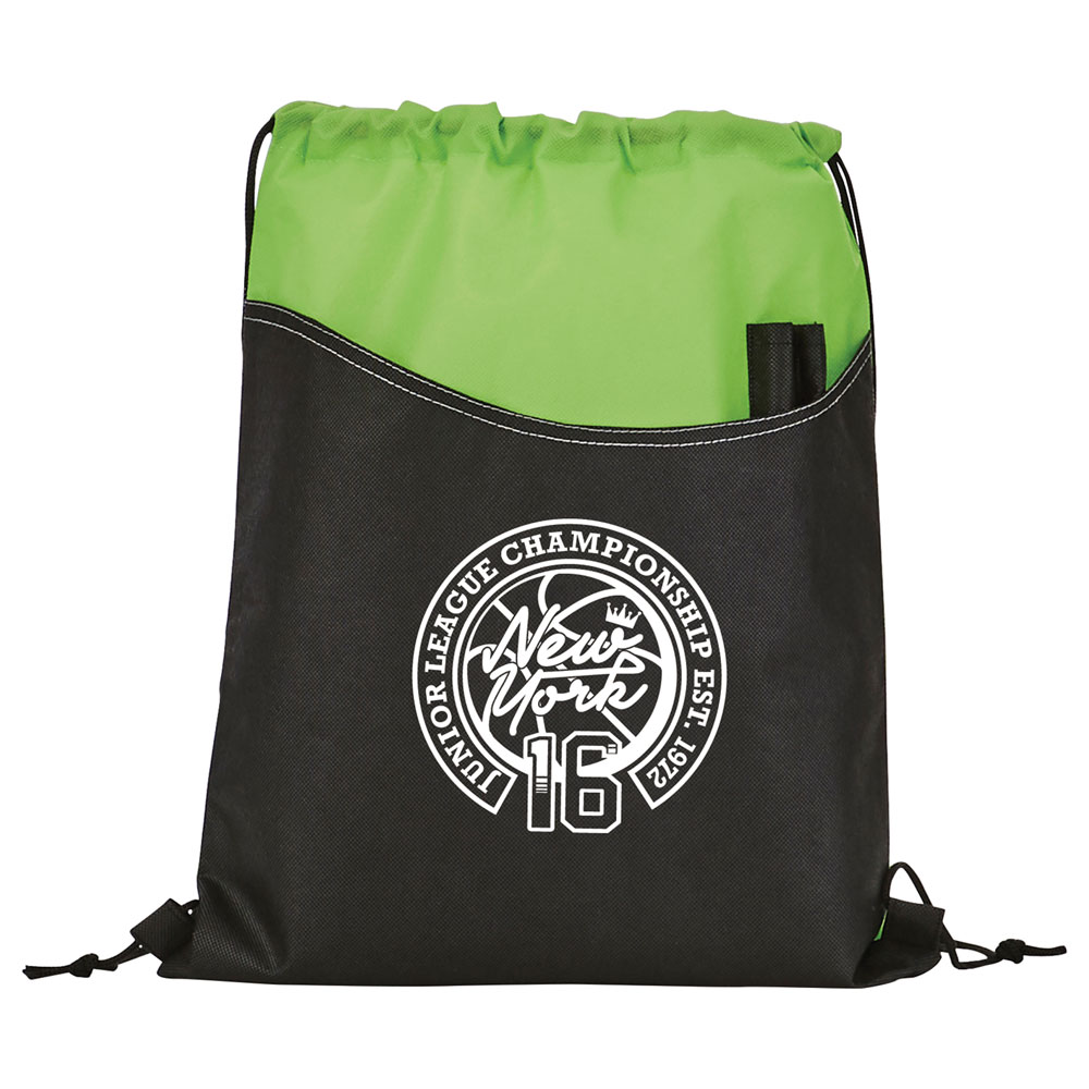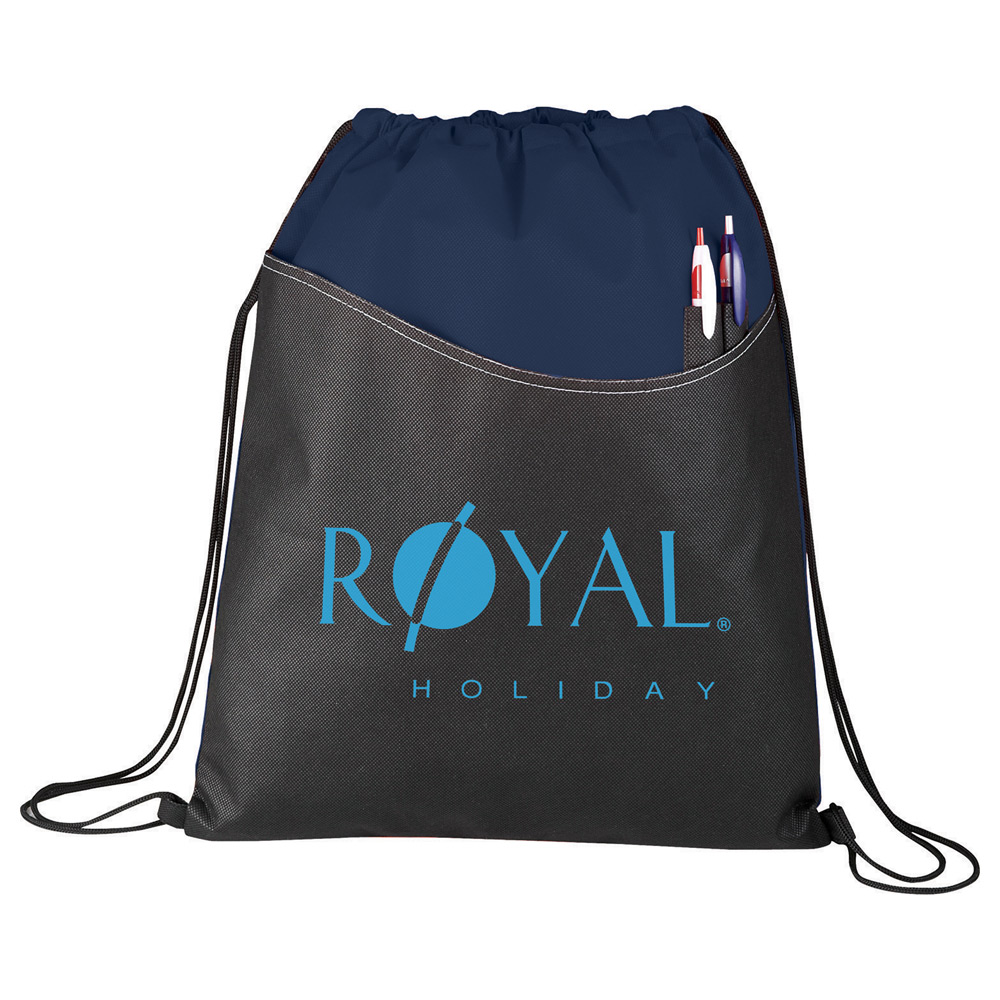 The Rivers Non-Woven Drawstring Bag has an open main compartment with an open front pocket with double pen sleeves and a cinching rope closure.