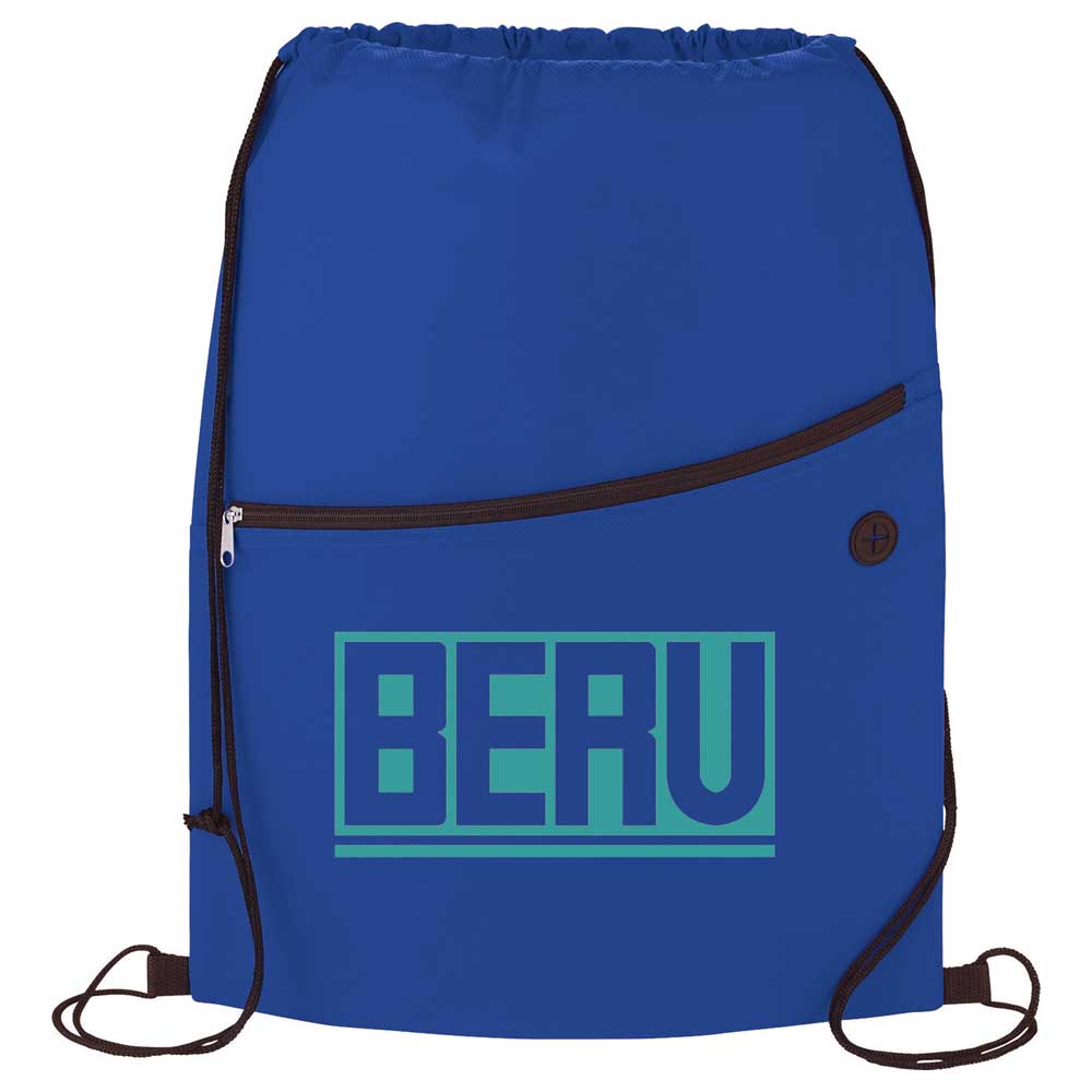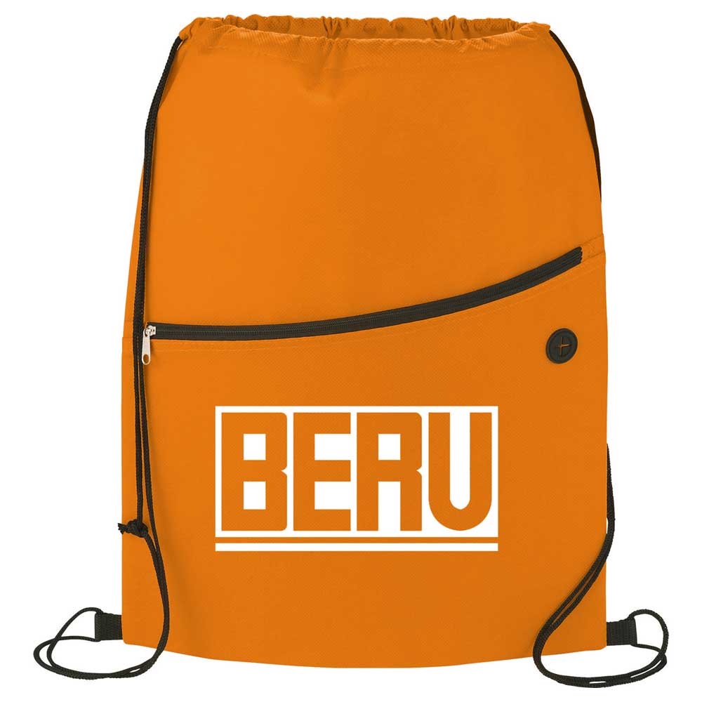 The Sidekick Non-Woven Drawstring Bag has an open main compartment with cinching rope closure. It also features a zippered front pocket with a handy earbud port and reinforced corner tabs.