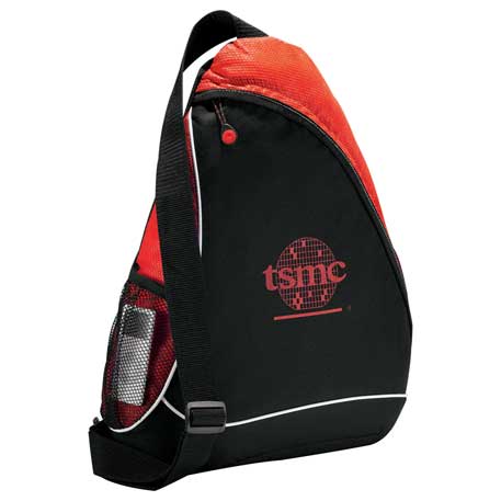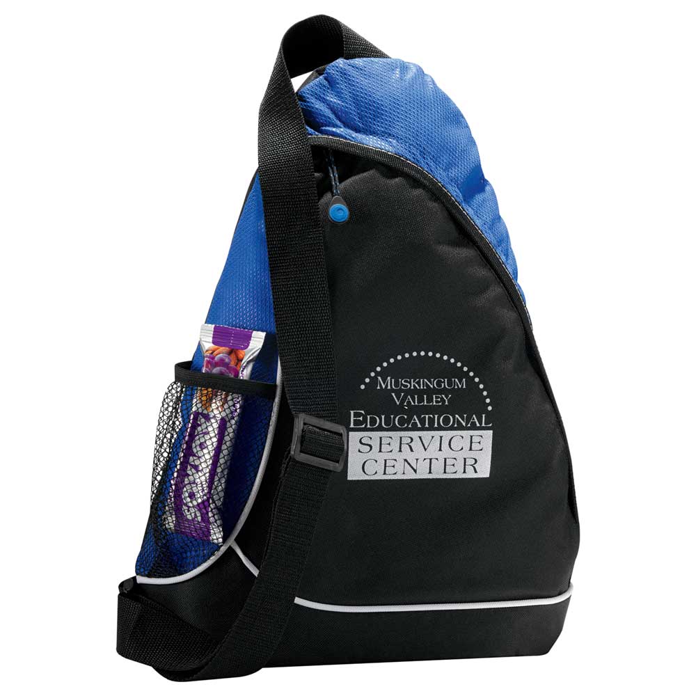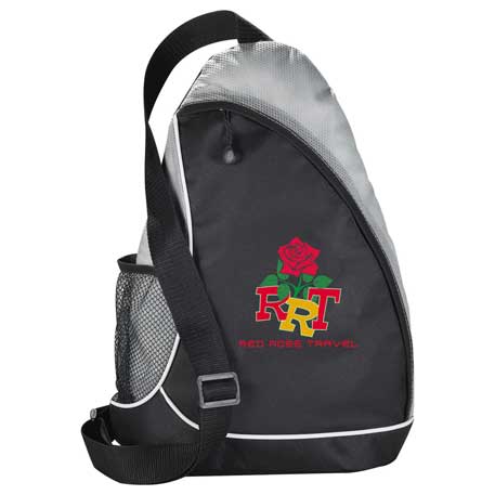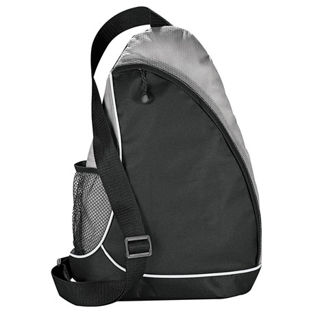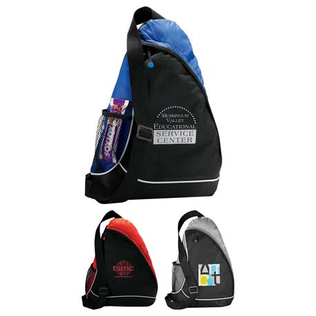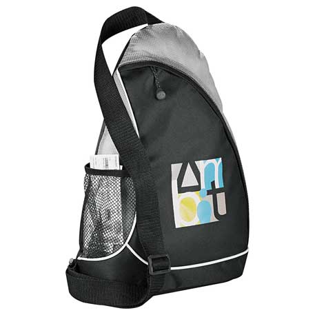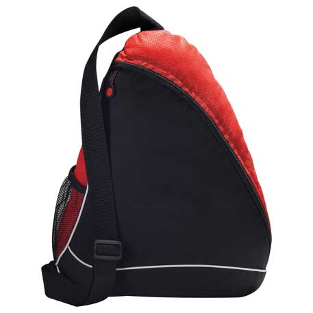 The Sling Shot Sling Backpack features a main zippered compartment, a side mesh water bottle pocket and an adjustable cross-over shoulder strap.