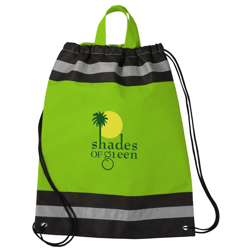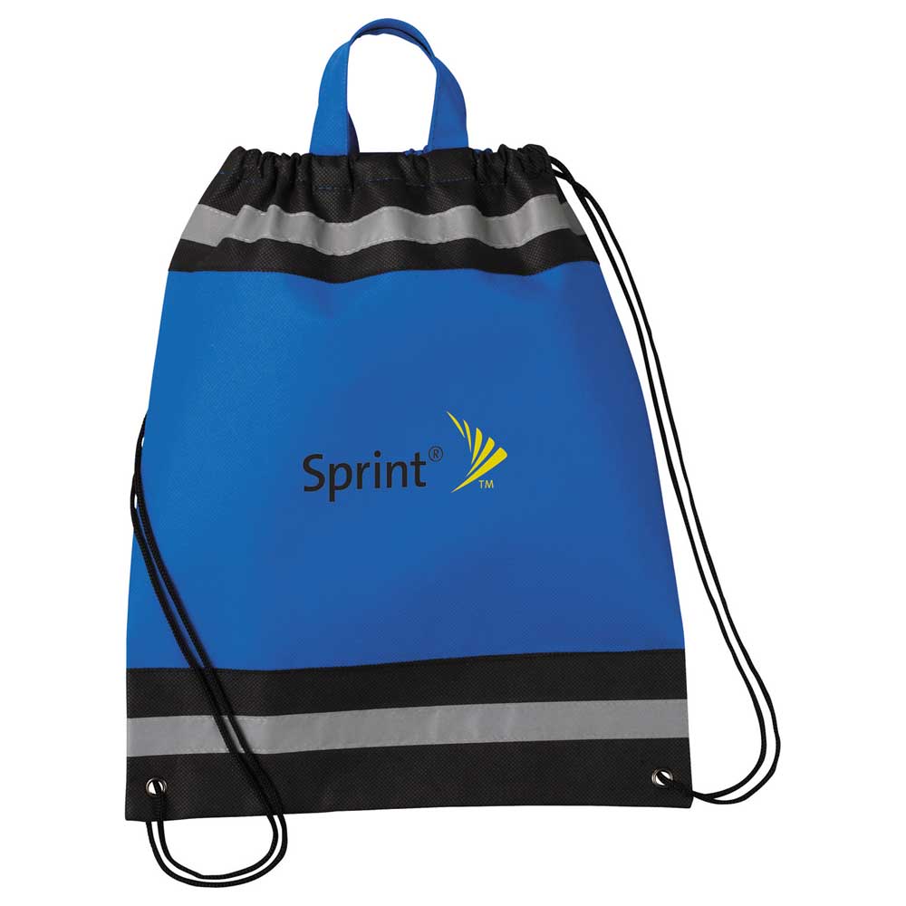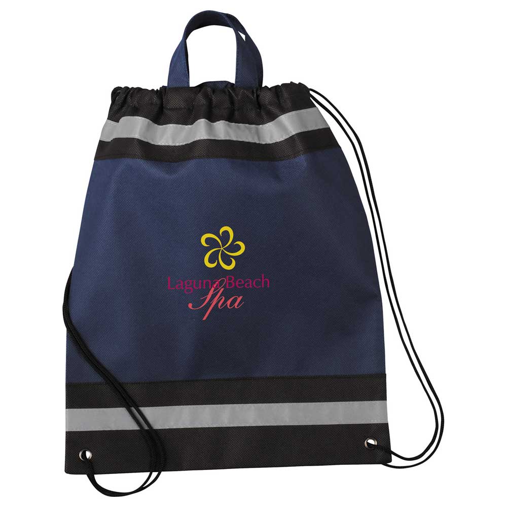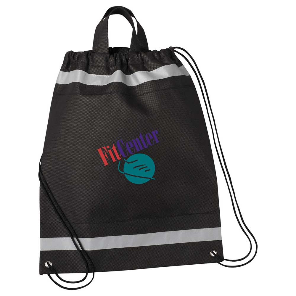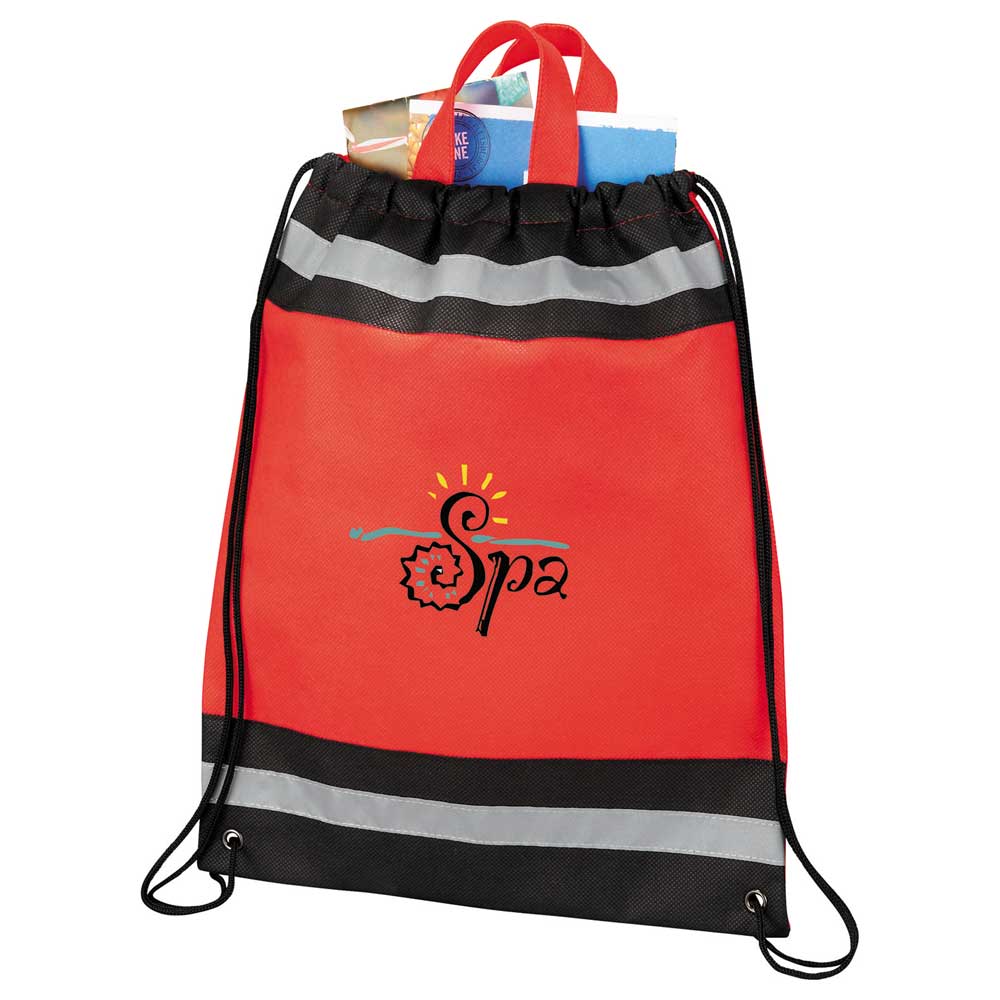 The Small Non-Woven Drawstring Bag has an open main compartment with reflective stripes and a cinching rope closure.