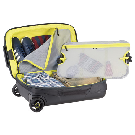 Easy to pack more, separate clean from dirty or keep clothes in place thanks to the internal compression panel. Smooth and easy transport with tough, oversized wheels and V-Tubing telescoping handles. Effortless travel thanks to the piggyback strap attachment loop that allows an additional bag to be hooked on. Bag design absorbs the impact of travel due to the durable exoskeleton and molded polycarbonate back panel. Smooth lifting and rearranging in overhead bins with top, side and bottom grab handles. •Complies with carry-on requirements for most airlines. Divided main compartment keeps clean-from-dirty, wet-from-dry, and work-from-play. Protects contents from the elements with durable, water-resistant materials. Quick access to keys, wallet and smaller items through zippered mesh pocket. Built in ID card slot simplifies identification of bag.