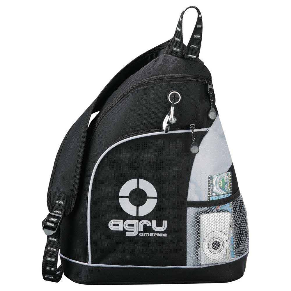 The Twister Sling Backpack features a zippered main compartment with an interior media pocket, an earbud port and a zippered front pocket and a mesh water bottle pocket. Contrast handle and adjustable strap.