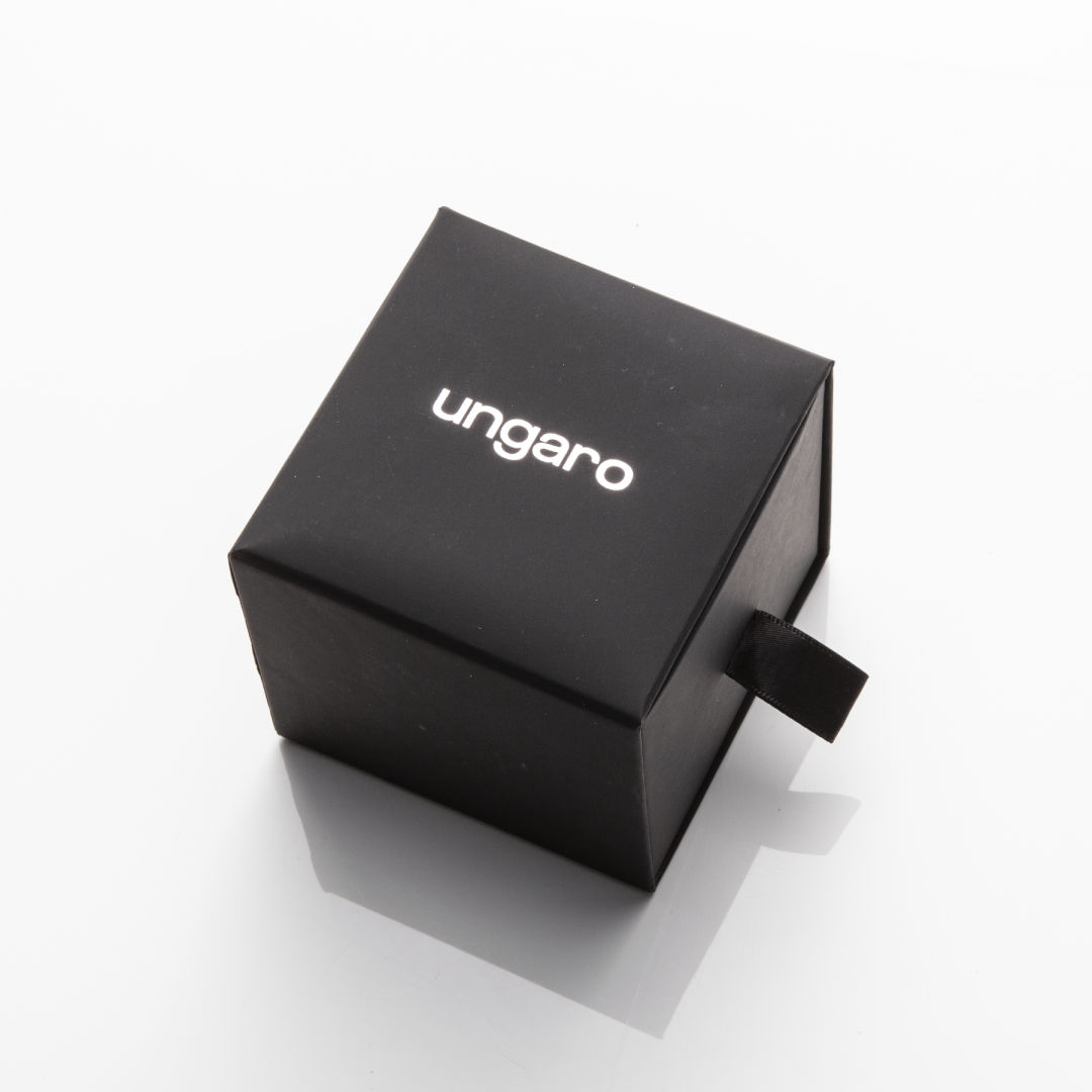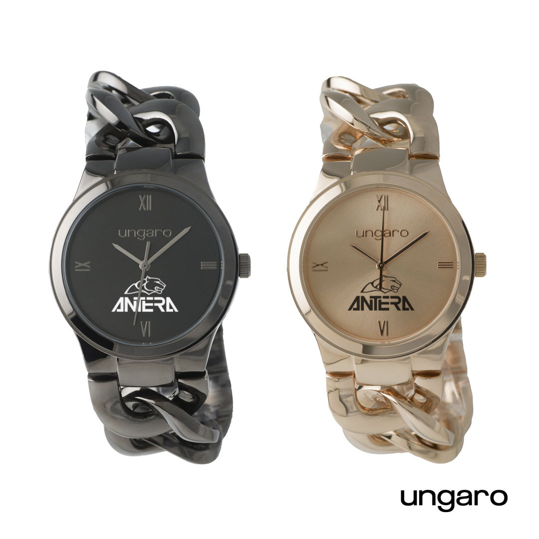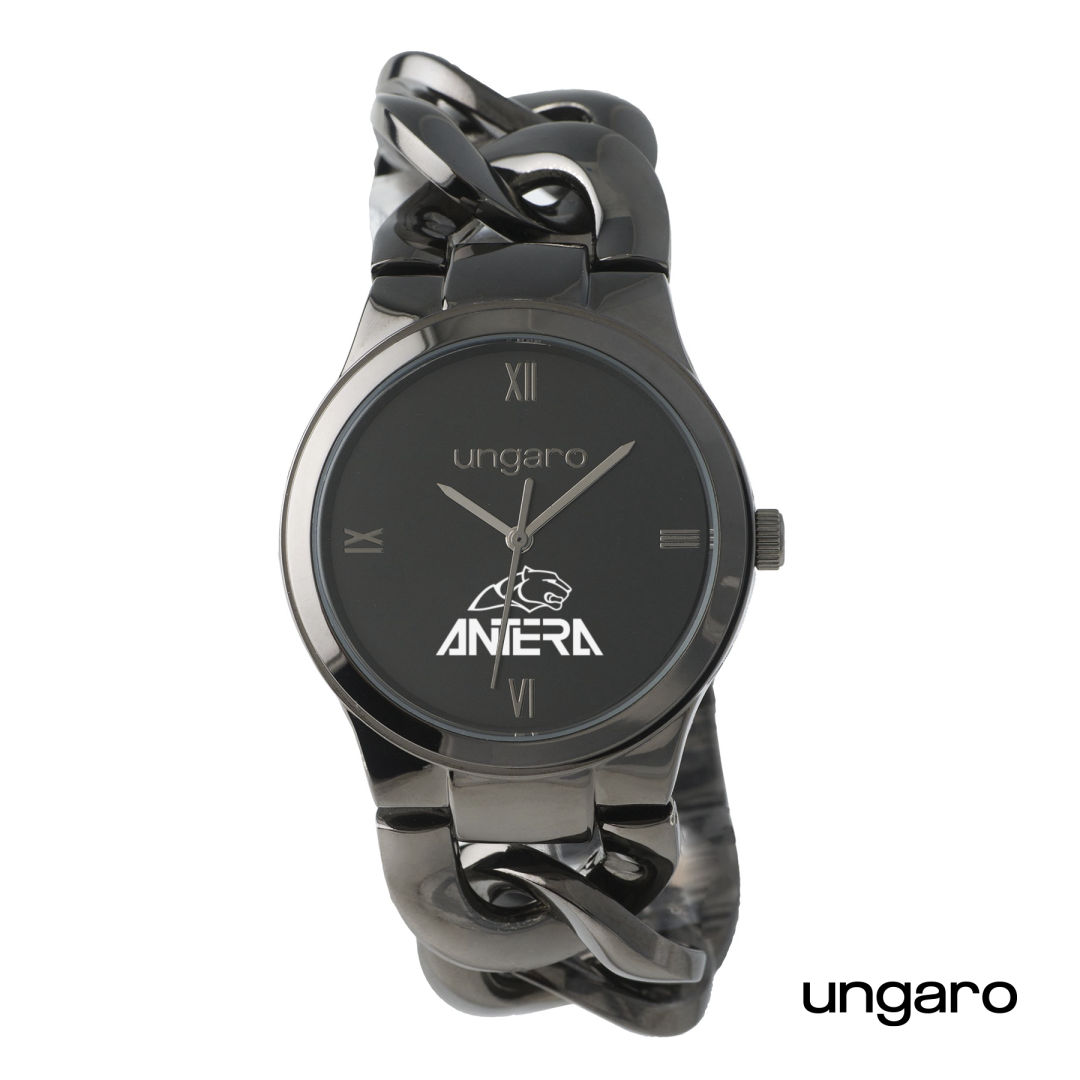 The shiny gunmetal braided metal strap of the Catena watch from Ungaro gives a very modern touch to this model.