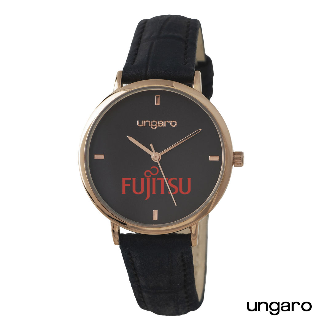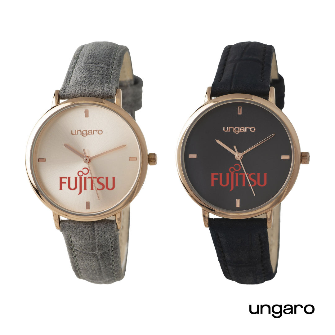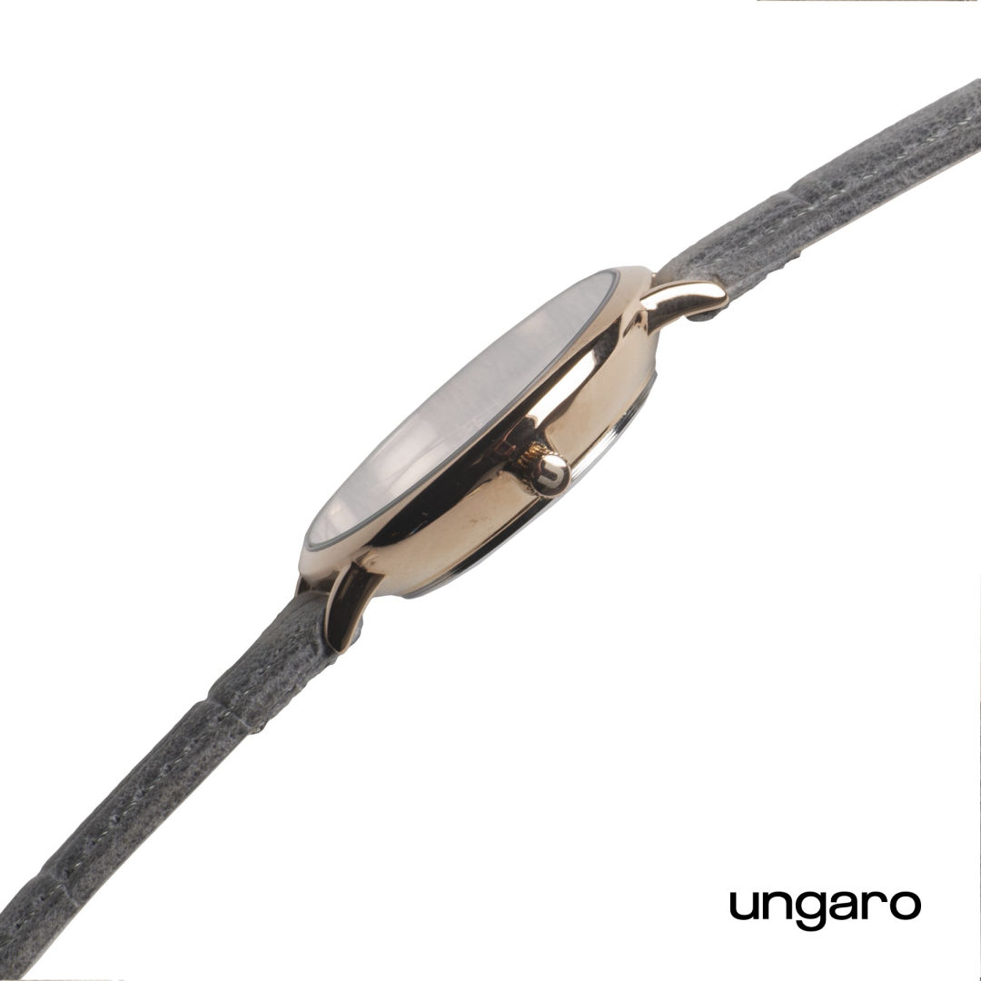 The Ungaro “Giada” watch is understated and feminine. Its bracelet is made of carefully chosen leathers, embossed with a croc print, giving it a fashionable and luxurious feel. The case is delicate and slim and plated in rosegold. The dial design is minimalistic and is finished with a sunray effect. Available in gray or navy.