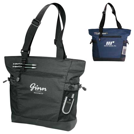 Great for tradeshows, conventions and business meetings. Zippered main compartment. Zippered front pocket. Side mesh drawstring pockets. Pen loops. 15″ handle drop height.