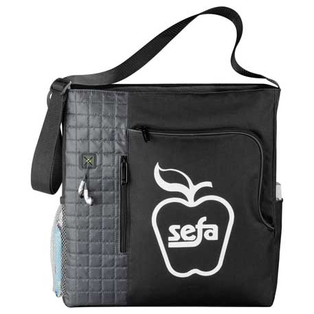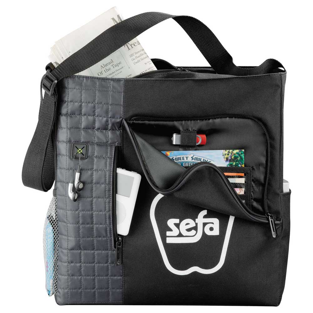 Great for tradeshows, conventions, and business meetings. Main zippered compartment. Front zippered pocket with full interior organization. Vertical media pocket with earbud port access. Side mesh and accessory pockets. Adjustable shoulder strap.