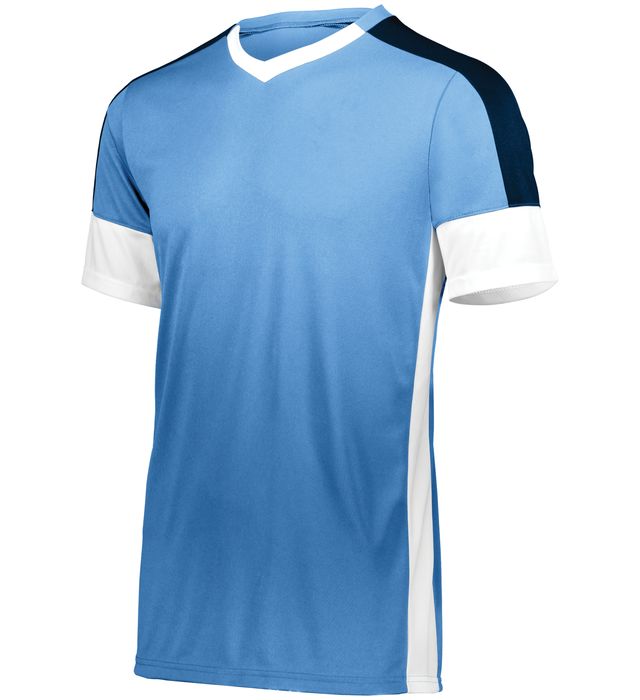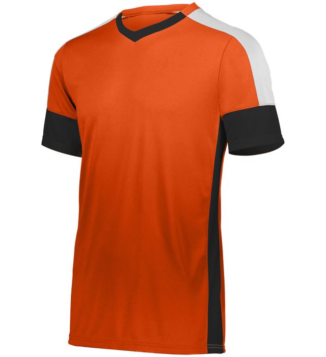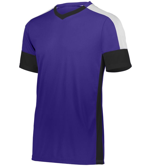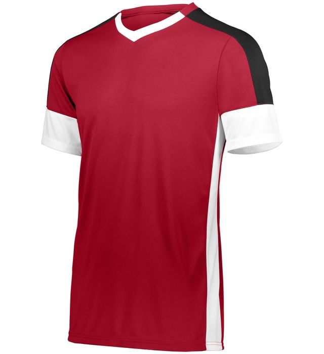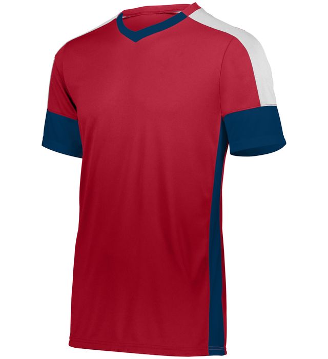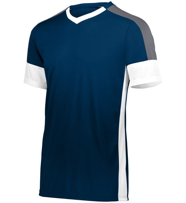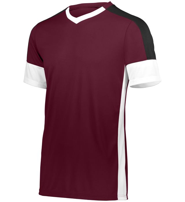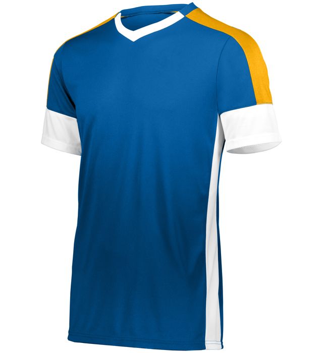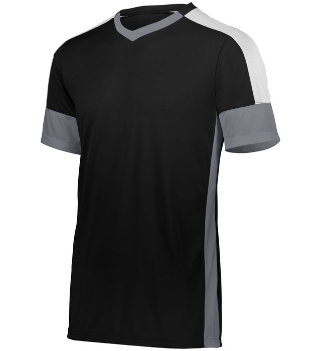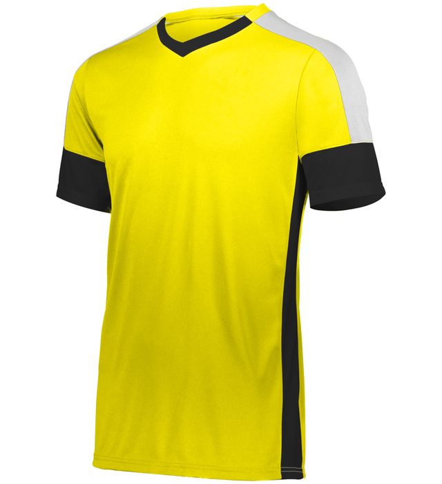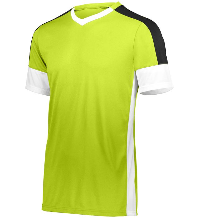 Bring flair to the field with the High Five Wembley Soccer Jersey. The contrast color sleeve, shoulder and side inserts add a touch of style to this V-neck raglan sleeve jersey. This soccer jersey is ultra comfortable thanks to its 100% polyester knit, keeping you cool and dry. As tough as it is stylish, The Wembley is durable enough to last many seasons.