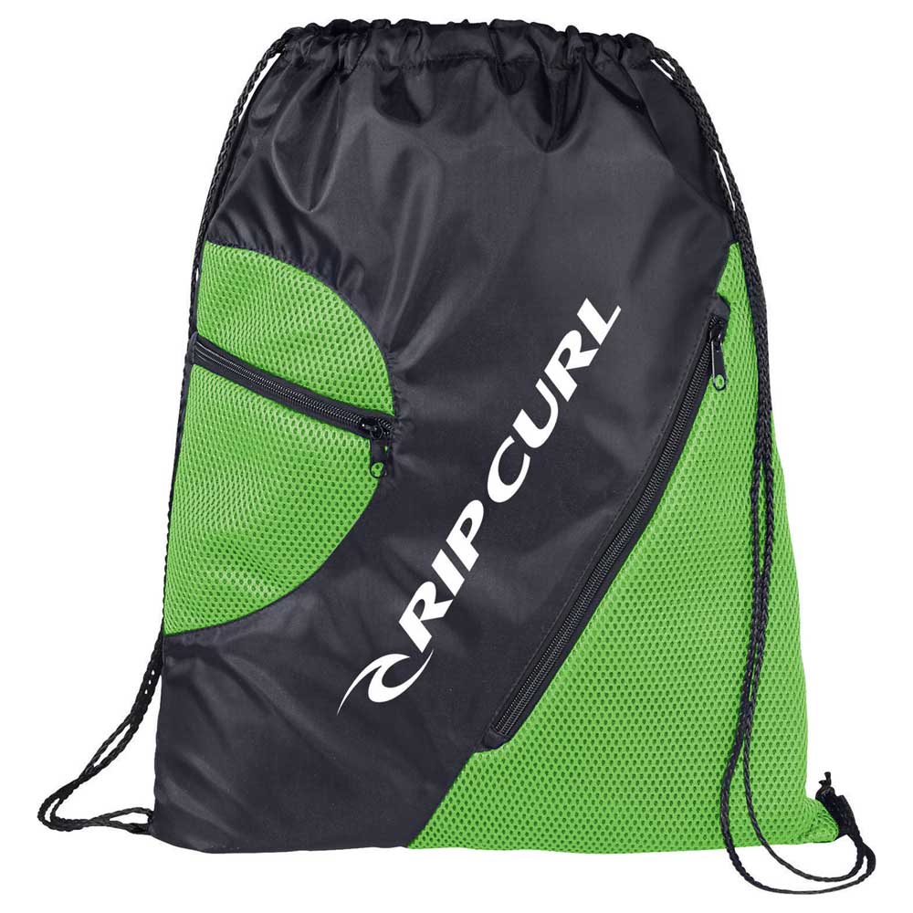 The Zippered Mesh Drawstring Bag has a large main compartment with two front zippered mesh pockets for additional storage. The cinching rope closure keeps contents safe and secure.
